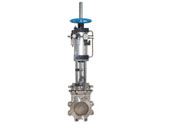 手動帶氣動刀形閘閥具有氣動執行機構(雙層氣缸并帶有緩沖機構)和手動及其保護機構(手動和可自鎖的氣動手動轉換裝置)的低支架明桿閘閥。該閥由于采用雙層氣缸結構其與單氣缸式氣動閘閥相比提升力增大了一倍。這就從根本上解決了單氣缸氣動閘閥的某些閥板在閥體內楔死而打不開的弊病。而且由于該閥具備緩沖機構能有效地減輕了關閉閥門時。由于活塞下行沖擊而造成的閥板密封面和閥體密封面的磨損,同時也能避免閘板卡死的現象。
