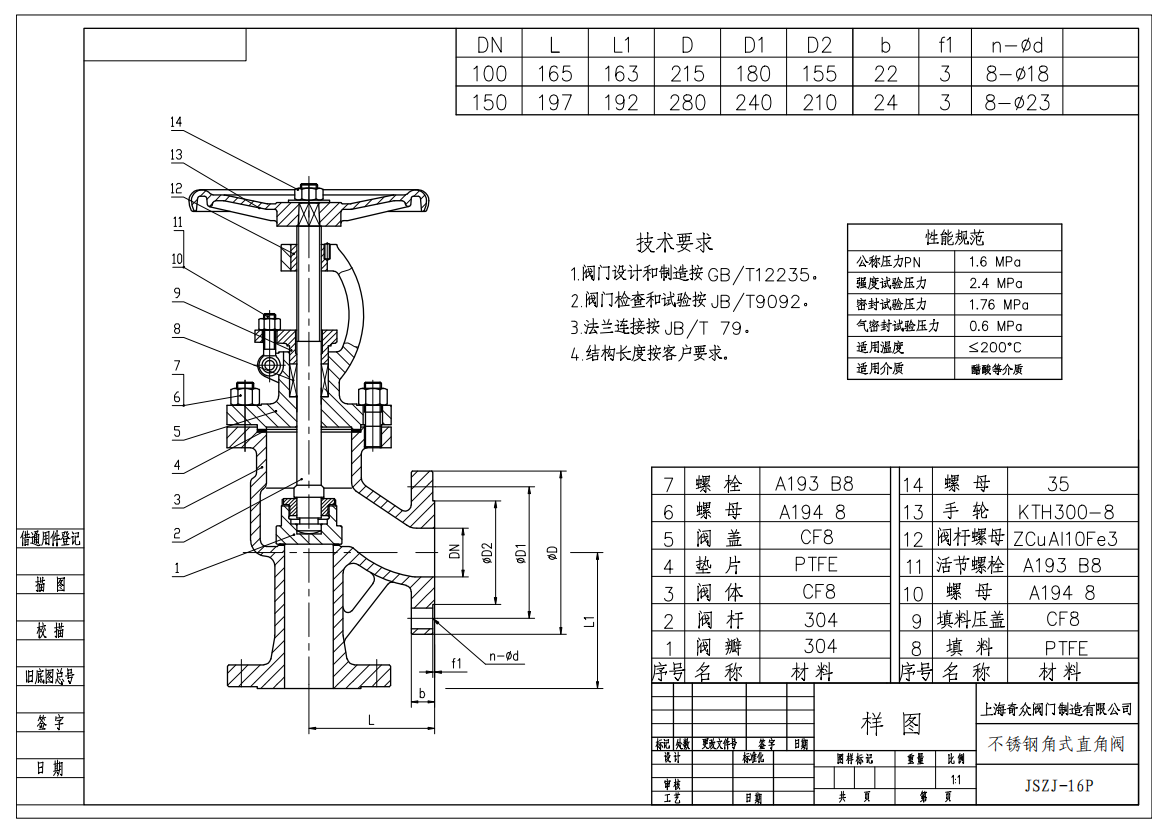 LSZJ-16PR不銹鋼直角閥(316L材質)主要性能參數: