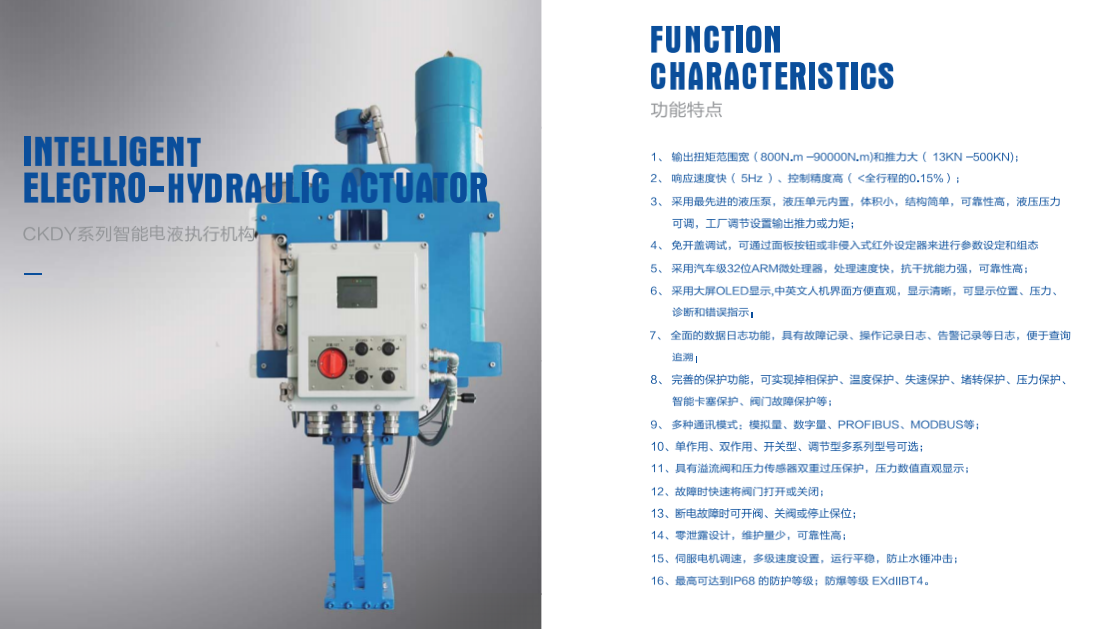 CKDY電液動平板閘閥奇眾牌液動執行器結構簡單、緊湊、體積小。傳動平穩可靠,有緩沖無撞擊現象。可根據需要采用不同的液壓油,可在-45℃~+300℃溫度范圍內工作,能防爆。可以獲得很大的輸出力矩,適合任何規格。輸出力矩可以通過定壓溢流閥得到精確的調整,包括開啟和關閉力矩的調整,甚至可以通過液壓儀表直接反映出來。在突然發生事故動力終斷時,仍可利用蓄能器進行一次或數次動力操作,這對長輸管線自動緊急切斷閥和進口噴放閥有特殊意義。