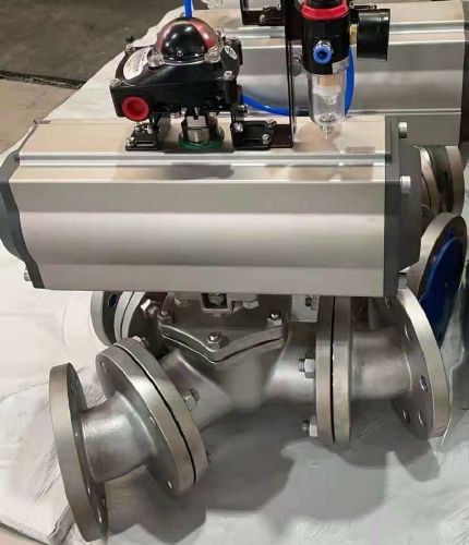 Q642F-氣動高平臺Y型三通球閥可以換向、分流、合流。氣動執行器可以配雙作用氣動或單作用氣動,雙電控電磁閥、單電控電磁閥、限位開關、手輪、空氣過濾減壓器。單作用氣動,靠彈簧的恢復張力使閥門復位。