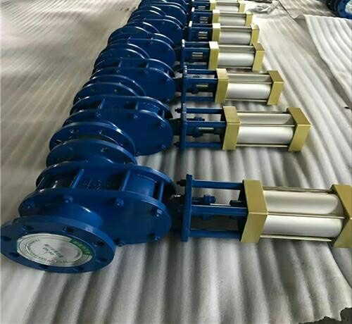 當(dāng)氣源從上進(jìn)氣口通入時(shí),閥桿帶動(dòng)閥板向下運(yùn)動(dòng),閥門關(guān)閉。當(dāng)氣源從下進(jìn)氣口通入時(shí),閥桿帶動(dòng)閥板向上運(yùn)動(dòng),閥門開啟。閥板與閥座之間加載彈簧,彈簧彈力始終使閥板壓向閥座保證閥門的密封性,又容許閥板在垂直上下方向移動(dòng),這有助于補(bǔ)償閥門零件的熱脹冷縮,并能克服任何背壓變化對(duì)密封的影響與防止顆粒介質(zhì)進(jìn)入兩密封面之間。