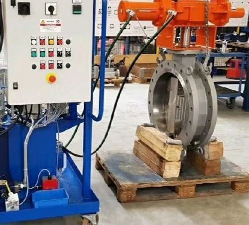 主閥密封副為三偏心結構,啟閉輕松,密封可靠。傳動箱結構緊湊,油缸尾部設有緩沖裝置,消除快關時對油缸的沖擊。液壓站主要控制閥均德國力士樂等螺紋式插裝閥產品,占用空間 小。普通啟閉操作時,壓力油源由油泵或汽輪機、TRT主機配套液壓站提供,快速關閉時,則通過蓄能器能源的快速釋放來實現。本閥除設有緩開、緩關、快關、停止等動作外,全開位還可以進行10%行程游動試驗,保證系統在緊急關閥時不會卡阻。PLC智能型控制系統,操作簡單,性能可靠,智能化程度高,可充分滿足用戶自動化控制的需要。